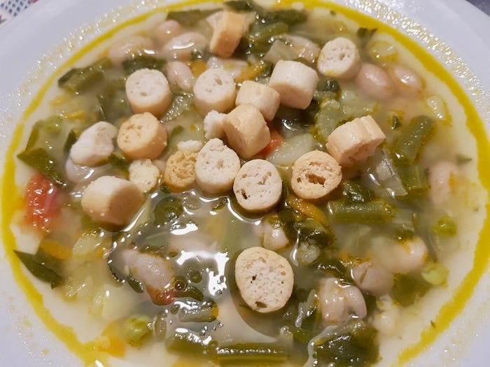 Nowadays, we add some fancy foods, such as croutons. In the past, they used to add stale bread in it. In this way, they would not waste any food, as my mother recalls: “In farms, when they butchered pork, they used to add its bones in the minestrone.” Today, cut up pancetta or pre-cooked pork rind (cotenne), which are frequently used to add flavor.