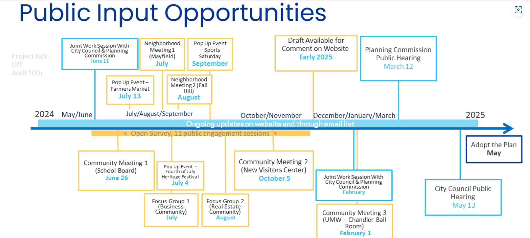 For a complete rundown of the comprehensive plan process, visit here. The flow chart below outlines key dates for public input.te