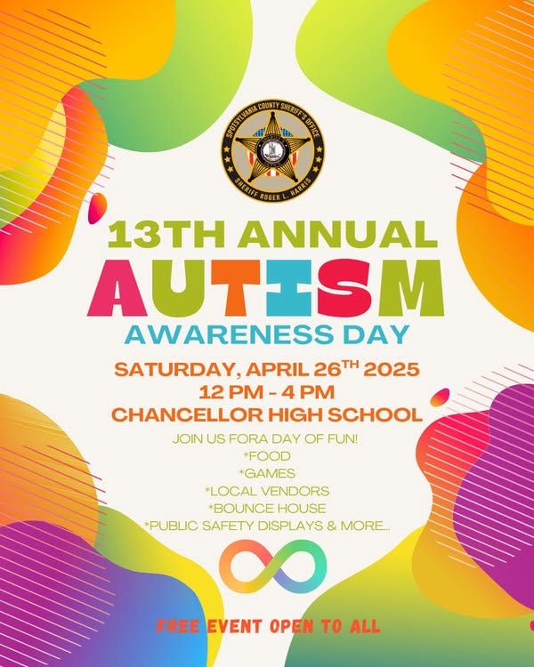 Saturday, 12 to 4 p.m.: Autism Awareness Day at Chancellor High School, featuring food, games, bounce house, vendors, public safety demonstrations, car seat inspections. Let’s come together to support autism awareness and enjoy a great day with the community! Free.