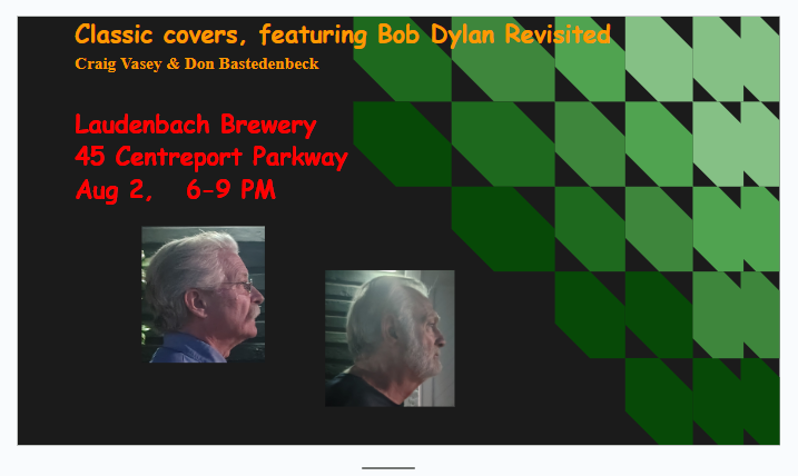 Join Craig Vasey & Don Bastedenbeck for a night of classic covers, including a tribute to the music of Bob Dylan. Enjoy great brews and live music in a laid-back setting.