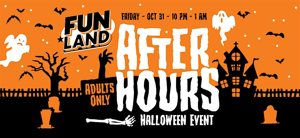 It’s Halloween with no kids allowed! Fun Land’s After Hours Adult Night brings unlimited premium attractions, free-play video games, and two drink tickets per guest. Costumes are encouraged, the rides are open, and the arcade lights glow late into the night.